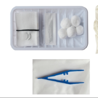 产品结构及组成: 本品由基本配置医用缝合针、非吸收性外科缝线和可选配置医用脱脂纱布块、一次性使用手术洞巾、一次性使用治疗巾、刀片、一次性使用口罩、帽、医用剪、医用棉球、医用镊、一次性使用灭菌橡胶外科手套、止血钳、医用碘伏棉球、一次性使用医用橡胶检查手套、一次性使用无菌敷贴、物品盒、包布组成。