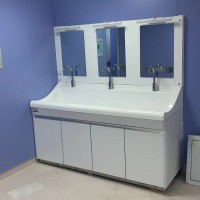 高分子洗手池材质特点:采用高分子材料一次吸塑成型,出水方式有:感应式、膝控式、脚踏式和手动开关,一台洗手池可客户要求选择单一出水方式或多种出水方式。洗手池分高背和低背,高背总高度1800mm,配有美容镜,照明灯,皂液器,可按客户要求配置烘手器和热水器。低背板无配置。