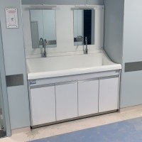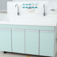 高分子洗手池材质特点:采用高分子材料一次吸塑成型,出水方式有:感应式、膝控式、脚踏式和手动开关,一台洗手池可客户要求选择单一出水方式或多种出水方式。洗手池分高背和低背,高背总高度1800mm,配有美容镜,照明灯,皂液器,可按客户要求配置烘手器和热水器。低背板无配置。