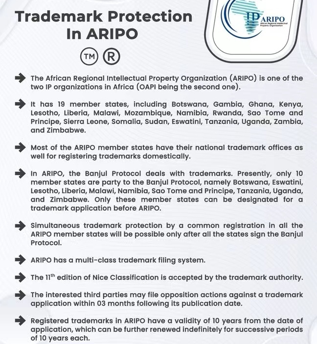 非洲地区知识产权组织(ARIPO)商标注册:它有19个成员国,包括博茨瓦纳冈比亚加纳肯尼亚莱索托、利比里亚马拉维、莫桑比克纳米